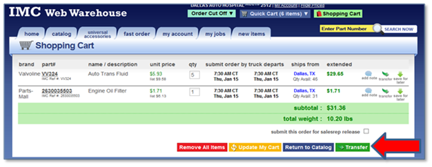 Once you finish shopping you will go to the Shopping Cart and click the 'Transfer' button: