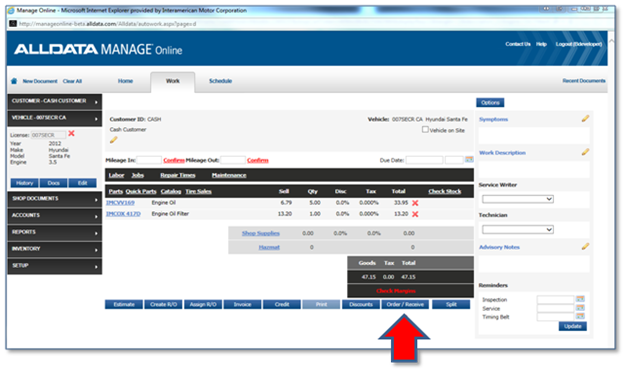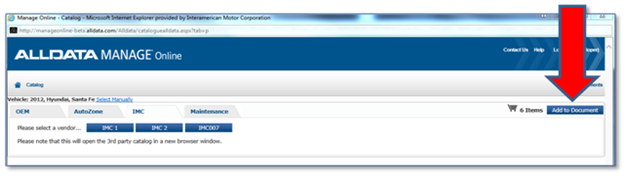 Click on the 'IMC' tab. You will be directed to the IMC Web Warehouse where you will choose the parts you need. The vehicle chosen in the AllData Manage